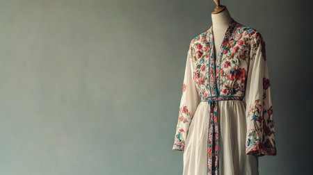 This stunning traditional robe showcases intricate embroidery and rich colors, ideal for cultural displays, fashion shoots, or elegant decor in a refined setting.