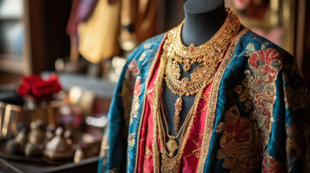 An ornate traditional outfit adorned with striking jewelry showcases rich craftsmanship in a luxurious setting, reflecting cultural elegance and aesthetic beauty.