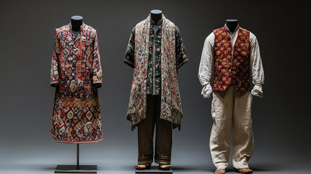Mannequins with traditional clothes in front of a gray background