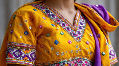 Close up of a colorful traditional garment featuring detailed embroidery and embellishments, showcasing cultural craftsmanship and vibrant design
