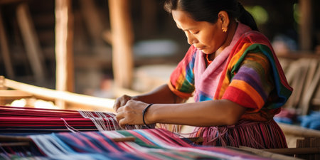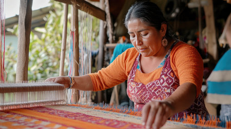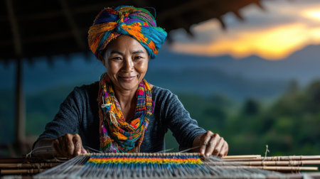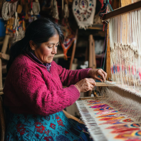 A skilled artisan expertly weaves vibrant textiles on a loom in a cozy workshop. The warm afternoon light enhances the intricate patterns she creates.
