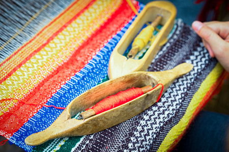 Closeup of skillful hill tribe woman's hand doing colorful cotton cloth weaving. Show traditional textile production and simply way of life by self- reliance practice. Thailand.