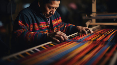 Expert craftsperson weaving homemade textile on loom generated by artificial intelligence