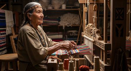 An elderly woman with traditional attire weaves colorful textiles on a wooden loom, focusing intently on her craft. The scene captures the preservation of cultural heritage and the intricate skill involved in hand-weaving.