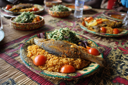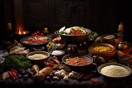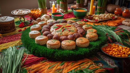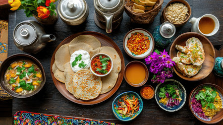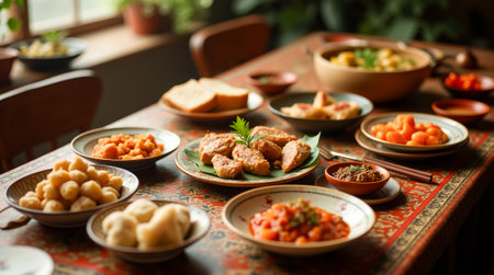 A vibrant traditional meal spread across a rustic table, featuring various colorful dishes, fresh ingredients, herbs, and garnishes, ideal for showcasing cultural cuisine.