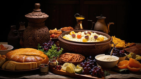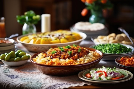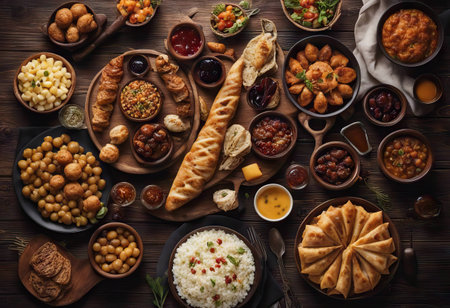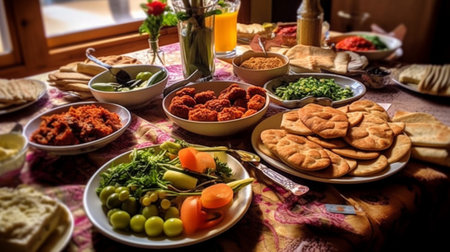 Arabic Cuisine: Middle Eastern traditional lunch. It's also Ramadan Iftar. The meal eaten by Muslims after sunset during Ramadan. Generative AI