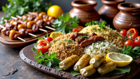 Mediterranean feast with grilled skewers, stuffed grape leaves, and lemon garnish. That the image is generated using AI.