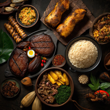 Assorted various Gabon food on a dark rustic background, copy space,Generative AI.