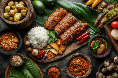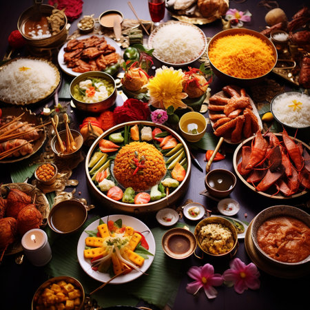 A stunning overhead view of a vibrant feast showcasing a variety of traditional dishes beautifully arranged on a large banana leaf surrounded by tropical leaves and flowers.