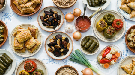 A top-down shot showcasing a variety of middle eastern food, including stuffed peppers, grape leaves, eggplant, pastries, and pickled vegetables on a table.