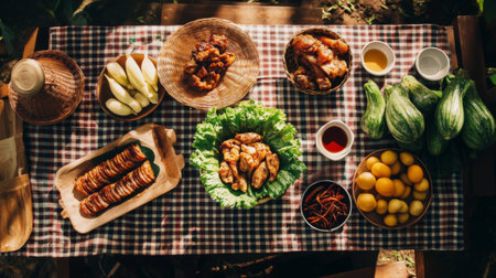 A top-down shot of a picnic spread featuring grilled squid alongside various sides like rice, salad, and dipping sauces, set on a checkered tablecloth