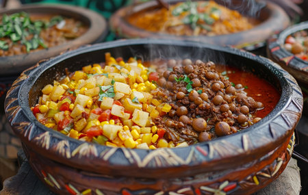 Handcrafted bowls filled with steaming vegetarian stew and beans, garnished with fresh herbs, offering a healthy street food option.