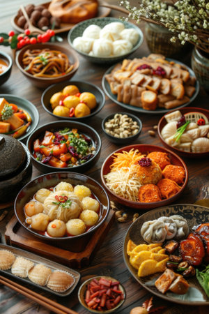 An eye catching illustration of Assortment of Korean traditional dishes. Created using Generative AI tools.