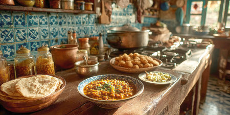 An inviting scene of traditional Moroccan cuisine laid out in a rustic kitchen. Features flavorful dishes and cultural ambiance, perfect for food, travel, and culinary themes.