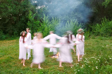 Midsummer. Young people in Slavic clothes revolve around a fire in the Midsummer
