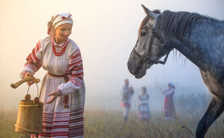 Young attractive womanin an embroidered shirt drinks a horse
