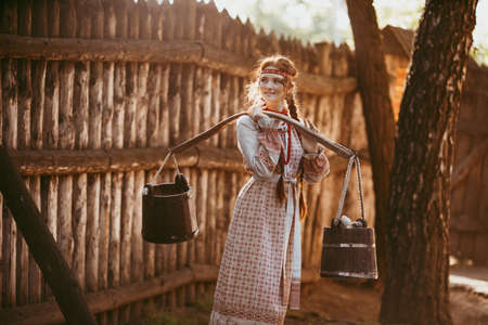 Beautiful Slavic girl with long blonde hair and brown eyes in a white and red embroidered suit and a yoke on her shoulders.Traditional clothing of the Ukrainian region.summer day