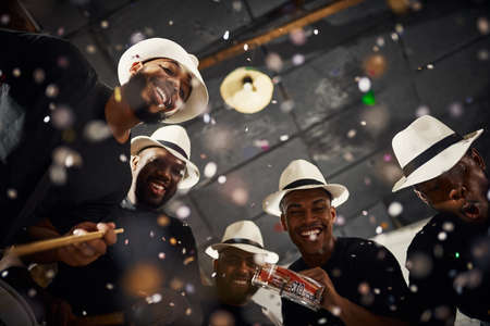 The vibe is totally electrifying right now. Portrait of a group of musical performers playing drums together.