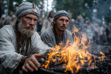 Two men sit attentively by a flickering fire during a traditional gathering in a dense forest.