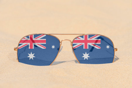 Sunglasses with glasses in the form of the flag of Australia lie on the sand. The concept of summer holidays, travel and tourism in Australia. Summer rest. holiday season