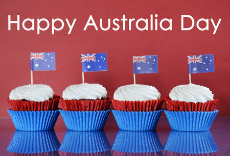 Happy Australia Day, January 26th, party food with red, white and blue cupcakes and Australian flags on red and blue background with sample text greeting.