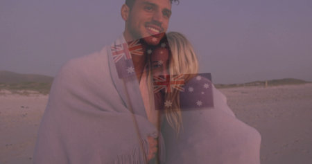 Laughing friends posing for selfie on beach at sunset with smartphone and Australian flag overlay. Camaraderie, leisure, outdoor, celebration, vibrant, joyful, diverse