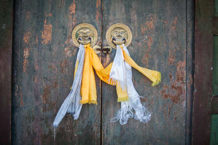 Entrance to a Buddhist temple, with scarves and lion heads.