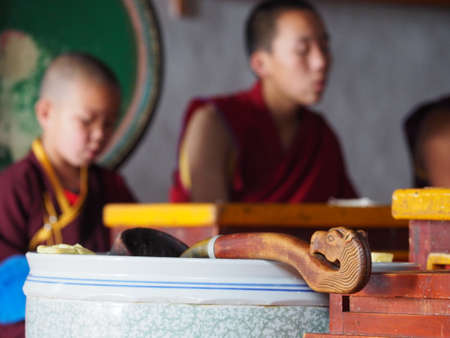 LHASA, TIBET, CHINA - AUGUST, 17 2018: Tibetan monks in the Ganden Monastery located at the top of Wangbur Mountain, Lhasa Tibet