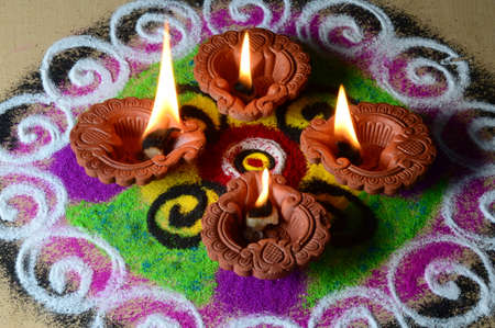 Clay diya lamps lit during diwali celebration, Rangoli in background