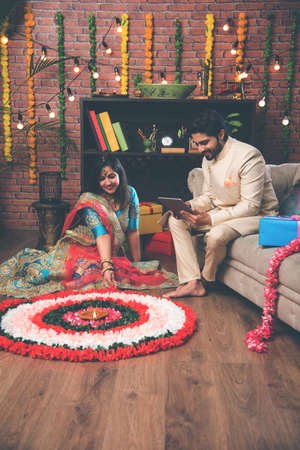 Indian couple making flower Rangoli on Diwali or Onam Festival, taking selfie or holding sweets