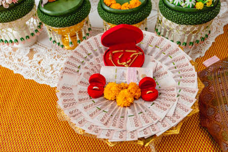 Bengali marriage rituals with beautiful decoration of multiple ingredient in brass bowls on a brass plate for bride and groom in Indian wedding