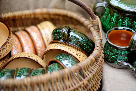 Ceramic dishes, tableware and jugs sold on Easter market in Vilnius. Lithuanian capital's annual traditional crafts fair is held every March on Old Town streets.
