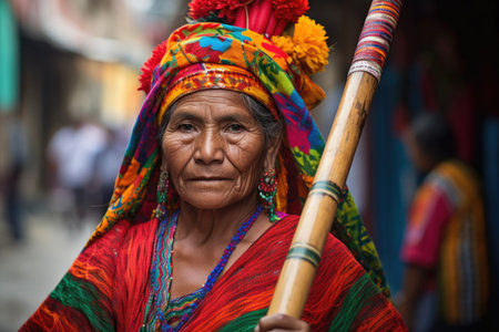 an ethnic woman wearing a colorful headdress and holding her staff, created with generative ai
