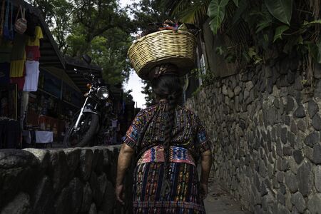 The lady walks the streets of Panajachel carrying a basket of souvenirs on her head.