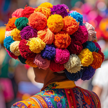 A participant in a vibrant cultural festival is seen from behind, showcasing an extraordinary headdress made of countless colorful pom-poms.