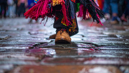 The rhythmic steps of a traditional folk dancer echo on the wet cobblestone street.