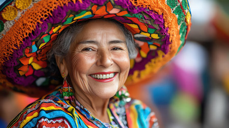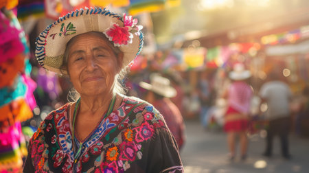 Elderly woman in traditional mexican attire smiling at vibrant colorful market