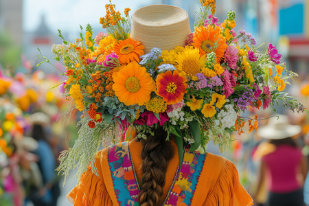 a parade participant at Feria de las Flores, carrying an elaborate flower arrangement on their back, vibrant blooms and a cheering crowd in the background, bright daylight highlighting the scene