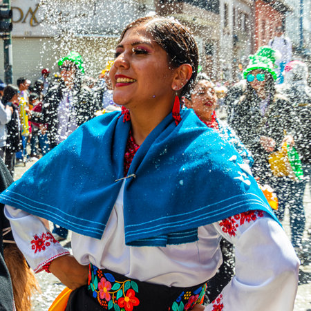 Cuenca, Ecuador - February 18, 2023: Carnival parade in Cuenca. A beautiful woman folk dancer in embroidered typical clothing. Foam splashes on everyone. Ecuador