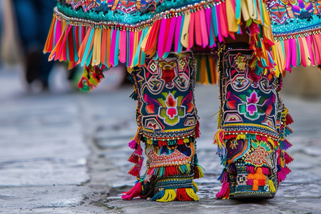 Vivid and colorful traditional Andean dance costumes, with intricate designs and accessories
