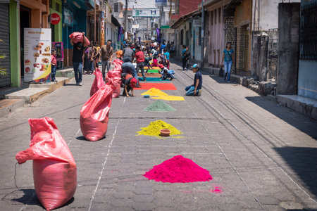 Santiago Atitlan, Guatemala - 30 March 2018: Local people making alfombra from colorful sawdust heaps for Semana Santa, Easter on the street