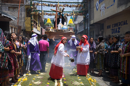 Santiago Atitlan, Guatemala - 30 March 2018: Crowd of local visitors at the Saint James the Apostle church watching the event for good Friday in Semana Santa, Easter