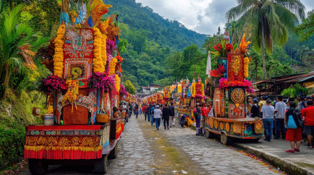 Cultural floats decorated with vibrant flowers and ethnic motifs parked at a parade gathering