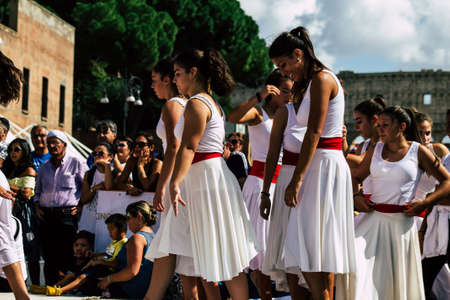 Rome Italy September 29, 2019 Celebrations of the 150th anniversary of the Italian gymnastics federation, public demonstration of young gymnasts in the streets of Rome near the Coliseum