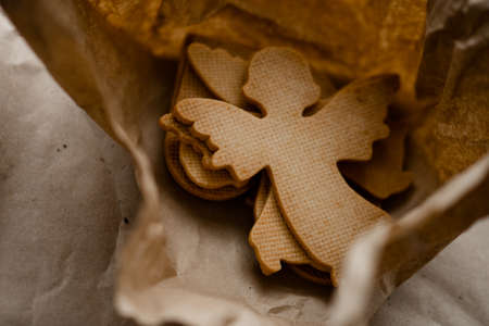 Christmas angels. Close up view of the biscuits like a christmas angels with texture laying at the craft paper box. Holidays and sweet cookies concept. Stock photo