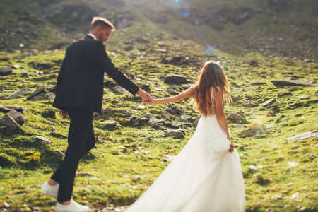 Bride in a dress with lace and groom holding hands and walking during their travel through the mountains. Nature landscape.