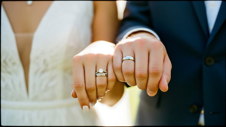 Close-up of a bride and groom holding hands, showcasing wedding rings and formal attire.