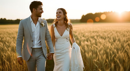 A smiling newlywed couple, a dark-skinned man and a fair-skinned woman, walk hand in hand through a serene wheat field, surrounded by warm golden light and a clear sky.