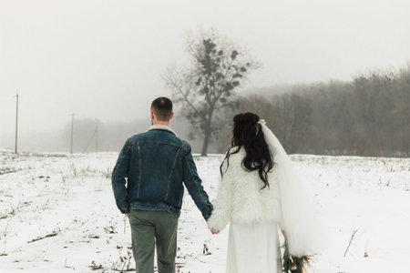 A newly married couple, a man in a black suit and a woman in a white gown, walk hand in hand. The scene evokes love, commitment, and celebration on their special day, with soft lighting and an intimate feel.