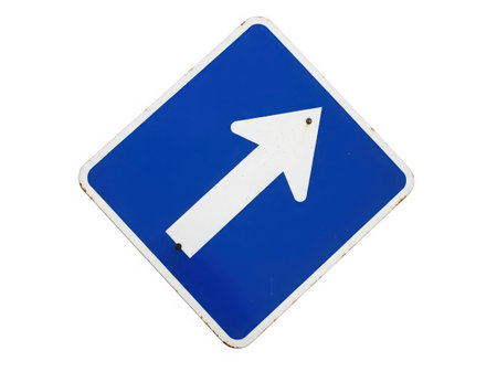 The image depicts a blue diamond-shaped traffic sign with a white arrow pointing upwards. This type of sign is commonly used to indicate the direction of traffic flow or to provide guidance on the road. The sign's shape and color make it easily recognizable and serve to alert drivers to follow the indicated direction.